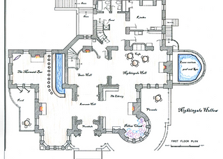 The Main floor or first floor, is where the Nightingales entertain the guests. It features "The Mermaids Bar", a Cafe, Nightingale Hall, a Lunatarium poor and spa and the Pillow Cloud. There is much more to come